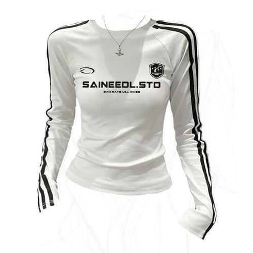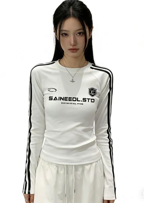 美式正肩撞色三條槓長袖T恤